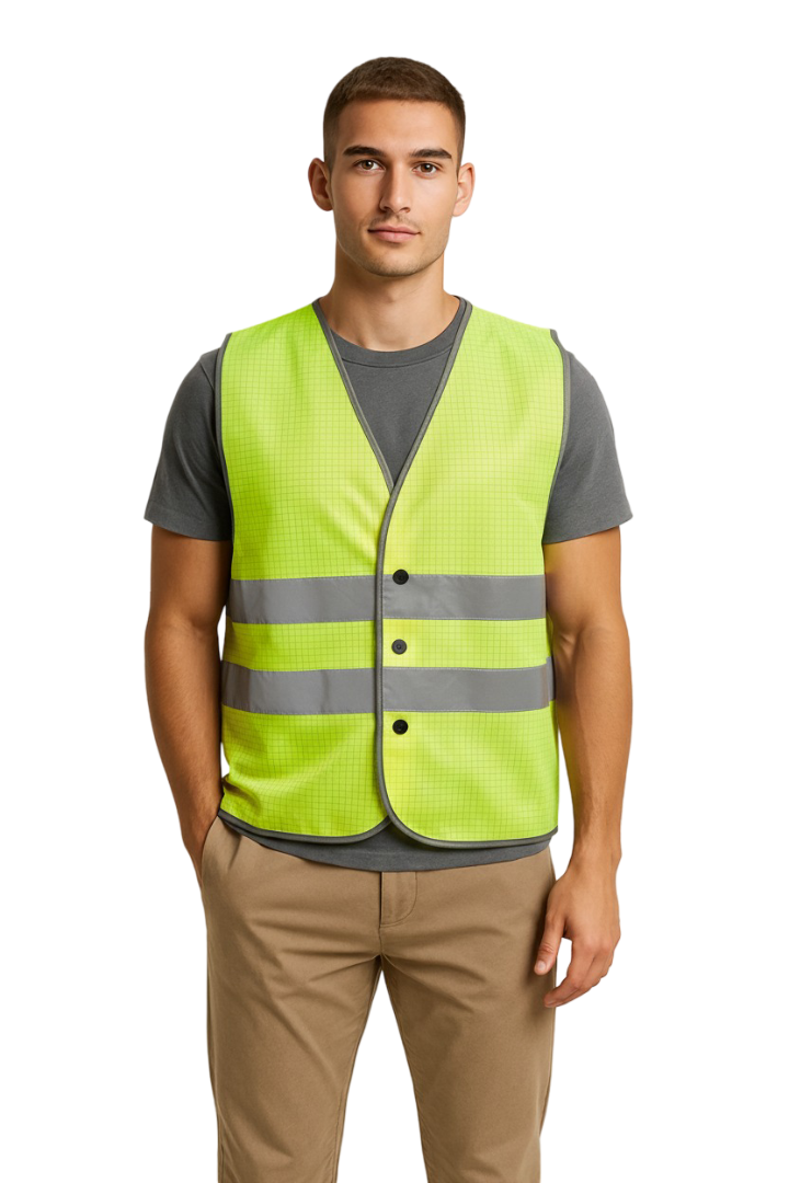 Изделие повышенной видимости 2-го класса защиты. Центральная застежка на пуговицы. Жилет прямого силуэта с глубоким вырезом горловины и пройм, центральная застежка на пуговицы. В нижней части полочек накладные боковые карманы, входящие в боковой шов и под окантовку. На спинке и на полочках настрочены в два ряда Световозвращающие полосы СОП 2 класса на расстоянии не менее 50 мм друг от друга. Все срезы жилета окантованы тесьмой