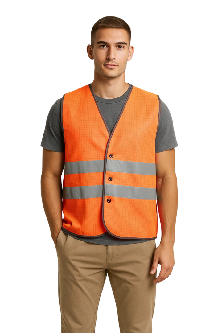 Изделие повышенной видимости 2-го класса защиты. Центральная застежка на пуговицы. Жилет прямого силуэта с глубоким вырезом горловины и пройм, центральная застежка на пуговицы. В нижней части полочек накладные боковые карманы, входящие в боковой шов и под окантовку. На спинке и на полочках настрочены в два ряда Световозвращающие полосы СОП 2 класса на расстоянии не менее 50 мм друг от друга. Все срезы жилета окантованы тесьмой