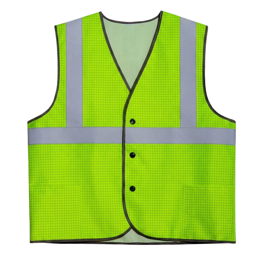 Изделие повышенной видимости 2-го класса защиты.Центральная застежка на пуговицы. Жилет прямого силуэта с глубоким вырезом горловины и пройм, центральная застежка на пуговицы. В нижней части полочек накладные боковые карманы, входящие в боковой шов и под окантовку. На спинке и на полочках настрочена световозвражающая полоса СОП 2 класса, а вертикальные – от плечевых швов до горизонтальных полос. Все срезы жилета окантованы тесьмой.