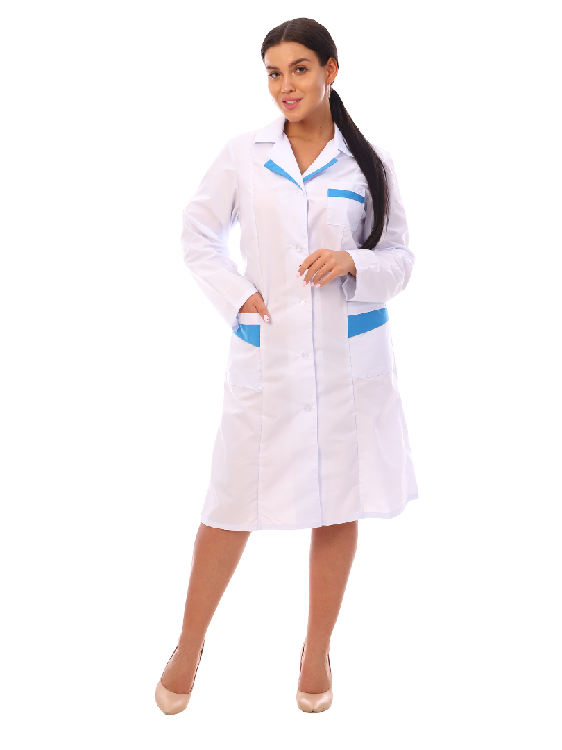 Халат женский “SG-Фея” летний с V-образным вырезом с 2 накладными карманами и одним нагрудным карманом, центральная застежка на пуговицы.
